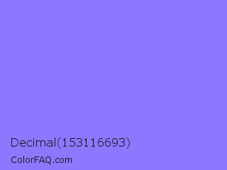 Decimal 153116693 Color is a light indigo color and the nearest color is Medium Slate Blue #7b68ee. Hex code #8c78ff and RGB value is rgb(140,120,255). In RGB color space, this color is composed of 55% red, 47% green, 100% blue, In CMYK color space, this color is composed of 45% cyan, 53% magenta, 0% yellow , 0% black , In HSL color space, this color has a hue angle of 249° , 100% saturation and 74% lightness.
