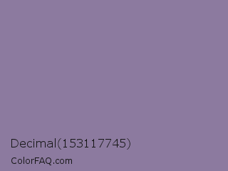 Decimal 153117745 Color is a normal violet color and the nearest color is Mamba #8e8190. Hex code #8c7a9f and RGB value is rgb(140,122,159). In RGB color space, this color is composed of 55% red, 48% green, 62% blue, In CMYK color space, this color is composed of 12% cyan, 23% magenta, 0% yellow , 38% black , In HSL color space, this color has a hue angle of 269° , 16% saturation and 55% lightness.