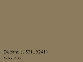 Decimal 153118241 Color is a normal orange color and the nearest color is Shadow #8a795d. Hex code #8c7b5d and RGB value is rgb(140,123,93). In RGB color space, this color is composed of 55% red, 48% green, 36% blue, In CMYK color space, this color is composed of 0% cyan, 12% magenta, 34% yellow , 45% black , In HSL color space, this color has a hue angle of 38° , 20% saturation and 46% lightness.