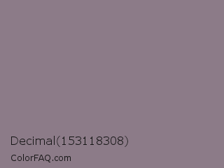 Decimal 153118308 Color is a normal magenta color and the nearest color is Monsoon #8a8389. Hex code #8c7b88 and RGB value is rgb(140,123,136). In RGB color space, this color is composed of 55% red, 48% green, 53% blue, In CMYK color space, this color is composed of 0% cyan, 12% magenta, 3% yellow , 45% black , In HSL color space, this color has a hue angle of 314° , 7% saturation and 52% lightness.