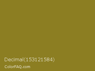 Decimal 153121584 Color is a normal yellow color and the nearest color is Hacienda #98811b. Hex code #8c7e22 and RGB value is rgb(140,126,34). In RGB color space, this color is composed of 55% red, 49% green, 13% blue, In CMYK color space, this color is composed of 0% cyan, 10% magenta, 76% yellow , 45% black , In HSL color space, this color has a hue angle of 52° , 61% saturation and 34% lightness.