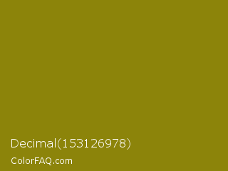 Decimal 153126978 Color is a dark yellow color and the nearest color is Dark Yellow #9b870c. Hex code #8c840a and RGB value is rgb(140,132,10). In RGB color space, this color is composed of 55% red, 52% green, 4% blue, In CMYK color space, this color is composed of 0% cyan, 6% magenta, 93% yellow , 45% black , In HSL color space, this color has a hue angle of 56° , 87% saturation and 29% lightness.
