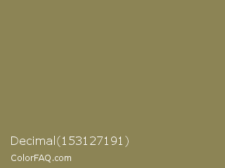 Decimal 153127191 Color is a normal yellow color and the nearest color is Dark Tan #918151. Hex code #8c8455 and RGB value is rgb(140,132,85). In RGB color space, this color is composed of 55% red, 52% green, 33% blue, In CMYK color space, this color is composed of 0% cyan, 6% magenta, 39% yellow , 45% black , In HSL color space, this color has a hue angle of 51° , 24% saturation and 44% lightness.