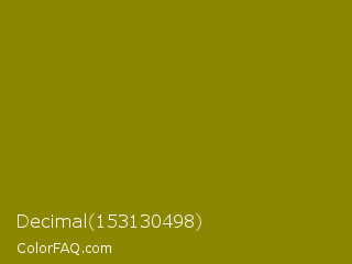 Decimal 153130498 Color is a dark yellow color and the nearest color is Olive #808000. Hex code #8c8702 and RGB value is rgb(140,135,2). In RGB color space, this color is composed of 55% red, 53% green, 1% blue, In CMYK color space, this color is composed of 0% cyan, 4% magenta, 99% yellow , 45% black , In HSL color space, this color has a hue angle of 58° , 97% saturation and 28% lightness.