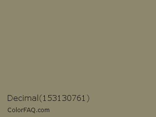 Decimal 153130761 Color is a normal yellow color and the nearest color is Olive Haze #8b8470. Hex code #8c876d and RGB value is rgb(140,135,109). In RGB color space, this color is composed of 55% red, 53% green, 43% blue, In CMYK color space, this color is composed of 0% cyan, 4% magenta, 22% yellow , 45% black , In HSL color space, this color has a hue angle of 50° , 12% saturation and 49% lightness.