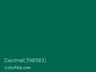 Decimal 598583 Color is a very dark cyan color and the nearest color is Bottle Green #006a4e. Hex code #01684d and RGB value is rgb(1,104,77). In RGB color space, this color is composed of 0% red, 41% green, 30% blue, In CMYK color space, this color is composed of 99% cyan, 0% magenta, 26% yellow , 59% black , In HSL color space, this color has a hue angle of 164° , 98% saturation and 21% lightness.
