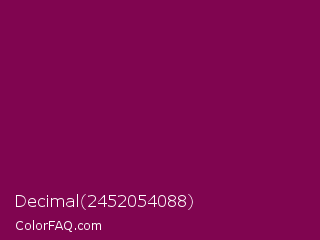 Decimal 2452054088 Color is a dark magenta color and the nearest color is Rose Bud Cherry #800b47. Hex code #800550 and RGB value is rgb(128,5,80). In RGB color space, this color is composed of 50% red, 2% green, 31% blue, In CMYK color space, this color is composed of 0% cyan, 96% magenta, 38% yellow , 50% black , In HSL color space, this color has a hue angle of 323° , 92% saturation and 26% lightness.
