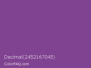 Decimal 2452167045 Color is a normal purple color and the nearest color is Vivid Violet #803790. Hex code #804391 and RGB value is rgb(128,67,145). In RGB color space, this color is composed of 50% red, 26% green, 57% blue, In CMYK color space, this color is composed of 12% cyan, 54% magenta, 0% yellow , 43% black , In HSL color space, this color has a hue angle of 287° , 37% saturation and 42% lightness.