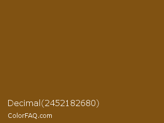 Decimal 2452182680 Color is a dark orange color and the nearest color is Rusty Nail #86560a. Hex code #805212 and RGB value is rgb(128,82,18). In RGB color space, this color is composed of 50% red, 32% green, 7% blue, In CMYK color space, this color is composed of 0% cyan, 36% magenta, 86% yellow , 50% black , In HSL color space, this color has a hue angle of 35° , 75% saturation and 29% lightness.