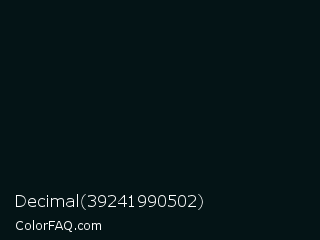 Decimal 39241990502 Color is a almost black cyan color and the nearest color is Blue Charcoal #010d1a. Hex code #041416 and RGB value is rgb(4,20,22). In RGB color space, this color is composed of 2% red, 8% green, 9% blue, In CMYK color space, this color is composed of 82% cyan, 9% magenta, 0% yellow , 91% black , In HSL color space, this color has a hue angle of 187° , 69% saturation and 5% lightness.
