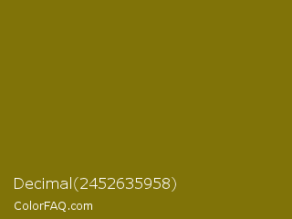 Decimal 2452635958 Color is a dark yellow color and the nearest color is Corn Harvest #8b6b0b. Hex code #807308 and RGB value is rgb(128,115,8). In RGB color space, this color is composed of 50% red, 45% green, 3% blue, In CMYK color space, this color is composed of 0% cyan, 10% magenta, 94% yellow , 50% black , In HSL color space, this color has a hue angle of 54° , 88% saturation and 27% lightness.