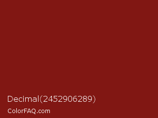 Decimal 2452906289 Color is a dark red color and the nearest color is Falu Red #801818. Hex code #811713 and RGB value is rgb(129,23,19). In RGB color space, this color is composed of 51% red, 9% green, 7% blue, In CMYK color space, this color is composed of 0% cyan, 82% magenta, 85% yellow , 49% black , In HSL color space, this color has a hue angle of 2° , 74% saturation and 29% lightness.