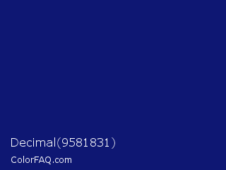 Decimal 9581831 Color is a dark blue color and the nearest color is Midnight Blue #191970. Hex code #0e1773 and RGB value is rgb(14,23,115). In RGB color space, this color is composed of 5% red, 9% green, 45% blue, In CMYK color space, this color is composed of 88% cyan, 80% magenta, 0% yellow , 55% black , In HSL color space, this color has a hue angle of 235° , 78% saturation and 25% lightness.