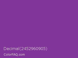 Decimal 2452960905 Color is a normal purple color and the nearest color is Vivid Violet #803790. Hex code #813499 and RGB value is rgb(129,52,153). In RGB color space, this color is composed of 51% red, 20% green, 60% blue, In CMYK color space, this color is composed of 16% cyan, 66% magenta, 0% yellow , 40% black , In HSL color space, this color has a hue angle of 286° , 49% saturation and 40% lightness.