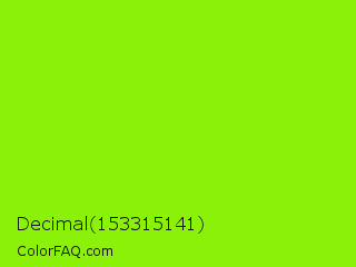 Decimal 153315141 Color is a normal green color and the nearest color is Chartreuse #7fff00. Hex code #8cf109 and RGB value is rgb(140,241,9). In RGB color space, this color is composed of 55% red, 95% green, 4% blue, In CMYK color space, this color is composed of 42% cyan, 0% magenta, 96% yellow , 5% black , In HSL color space, this color has a hue angle of 86° , 93% saturation and 49% lightness.