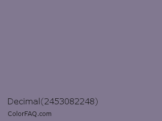 Decimal 2453082248 Color is a normal violet color and the nearest color is Topaz #7c778a. Hex code #817890 and RGB value is rgb(129,120,144). In RGB color space, this color is composed of 51% red, 47% green, 56% blue, In CMYK color space, this color is composed of 10% cyan, 17% magenta, 0% yellow , 44% black , In HSL color space, this color has a hue angle of 263° , 10% saturation and 52% lightness.