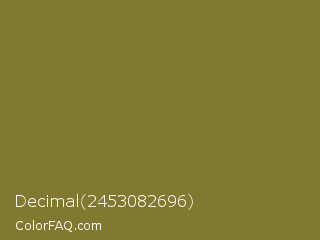 Decimal 2453082696 Color is a normal yellow color and the nearest color is Spanish Bistre #807532. Hex code #817930 and RGB value is rgb(129,121,48). In RGB color space, this color is composed of 51% red, 47% green, 19% blue, In CMYK color space, this color is composed of 0% cyan, 6% magenta, 63% yellow , 49% black , In HSL color space, this color has a hue angle of 54° , 46% saturation and 35% lightness.