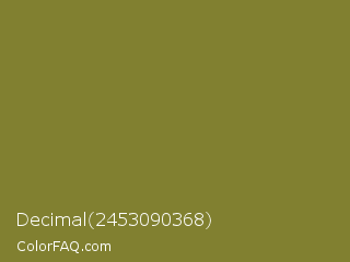 Decimal 2453090368 Color is a normal yellow color and the nearest color is Old Moss Green #867e36. Hex code #818030 and RGB value is rgb(129,128,48). In RGB color space, this color is composed of 51% red, 50% green, 19% blue, In CMYK color space, this color is composed of 0% cyan, 1% magenta, 63% yellow , 49% black , In HSL color space, this color has a hue angle of 59° , 46% saturation and 35% lightness.