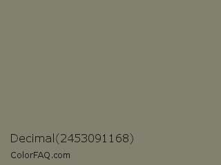 Decimal 2453091168 Color is a normal yellow color and the nearest color is Bandicoot #858470. Hex code #818170 and RGB value is rgb(129,129,112). In RGB color space, this color is composed of 51% red, 51% green, 44% blue, In CMYK color space, this color is composed of 0% cyan, 0% magenta, 13% yellow , 49% black , In HSL color space, this color has a hue angle of 60° , 7% saturation and 47% lightness.