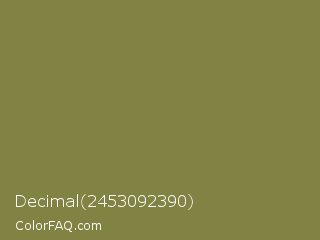 Decimal 2453092390 Color is a normal yellow color and the nearest color is Old Moss Green #867e36. Hex code #818342 and RGB value is rgb(129,131,66). In RGB color space, this color is composed of 51% red, 51% green, 26% blue, In CMYK color space, this color is composed of 2% cyan, 0% magenta, 50% yellow , 49% black , In HSL color space, this color has a hue angle of 62° , 33% saturation and 39% lightness.