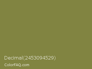 Decimal 2453094529 Color is a normal yellow color and the nearest color is Old Moss Green #867e36. Hex code #818441 and RGB value is rgb(129,132,65). In RGB color space, this color is composed of 51% red, 52% green, 25% blue, In CMYK color space, this color is composed of 2% cyan, 0% magenta, 51% yellow , 48% black , In HSL color space, this color has a hue angle of 63° , 34% saturation and 39% lightness.