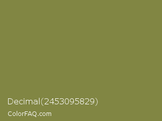 Decimal 2453095829 Color is a normal yellow color and the nearest color is Old Moss Green #867e36. Hex code #818643 and RGB value is rgb(129,134,67). In RGB color space, this color is composed of 51% red, 53% green, 26% blue, In CMYK color space, this color is composed of 4% cyan, 0% magenta, 50% yellow , 47% black , In HSL color space, this color has a hue angle of 64° , 33% saturation and 39% lightness.