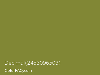 Decimal 2453096503 Color is a normal yellow color and the nearest color is Old Moss Green #867e36. Hex code #818735 and RGB value is rgb(129,135,53). In RGB color space, this color is composed of 51% red, 53% green, 21% blue, In CMYK color space, this color is composed of 4% cyan, 0% magenta, 61% yellow , 47% black , In HSL color space, this color has a hue angle of 64° , 44% saturation and 37% lightness.