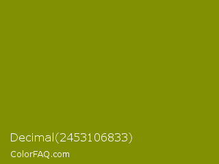 Decimal 2453106833 Color is a dark yellow color and the nearest color is Olive #808000. Hex code #819003 and RGB value is rgb(129,144,3). In RGB color space, this color is composed of 51% red, 56% green, 1% blue, In CMYK color space, this color is composed of 10% cyan, 0% magenta, 98% yellow , 44% black , In HSL color space, this color has a hue angle of 66° , 96% saturation and 29% lightness.
