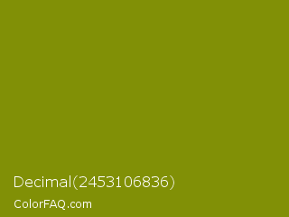 Decimal 2453106836 Color is a dark yellow color and the nearest color is Olive #808000. Hex code #819006 and RGB value is rgb(129,144,6). In RGB color space, this color is composed of 51% red, 56% green, 2% blue, In CMYK color space, this color is composed of 10% cyan, 0% magenta, 96% yellow , 44% black , In HSL color space, this color has a hue angle of 67° , 92% saturation and 29% lightness.