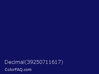 Decimal 39250711617 Color is a very dark blue color and the nearest color is Arapawa #110c6c. Hex code #111161 and RGB value is rgb(17,17,97). In RGB color space, this color is composed of 7% red, 7% green, 38% blue, In CMYK color space, this color is composed of 82% cyan, 82% magenta, 0% yellow , 62% black , In HSL color space, this color has a hue angle of 240° , 70% saturation and 22% lightness.