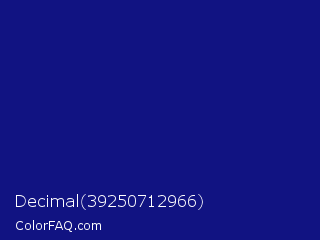 Decimal 39250712966 Color is a dark blue color and the nearest color is Deep Koamaru #1b127b. Hex code #111382 and RGB value is rgb(17,19,130). In RGB color space, this color is composed of 7% red, 7% green, 51% blue, In CMYK color space, this color is composed of 87% cyan, 85% magenta, 0% yellow , 49% black , In HSL color space, this color has a hue angle of 239° , 77% saturation and 29% lightness.