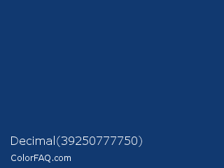 Decimal 39250777750 Color is a dark blue color and the nearest color is Regal Blue #013f6a. Hex code #113970 and RGB value is rgb(17,57,112). In RGB color space, this color is composed of 7% red, 22% green, 44% blue, In CMYK color space, this color is composed of 85% cyan, 49% magenta, 0% yellow , 56% black , In HSL color space, this color has a hue angle of 215° , 74% saturation and 25% lightness.