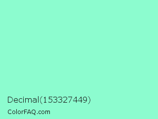 Decimal 153327449 Color is a light green color and the nearest color is Aquamarine #7fffd4. Hex code #8cfccf and RGB value is rgb(140,252,207). In RGB color space, this color is composed of 55% red, 99% green, 81% blue, In CMYK color space, this color is composed of 44% cyan, 0% magenta, 18% yellow , 1% black , In HSL color space, this color has a hue angle of 156° , 95% saturation and 77% lightness.