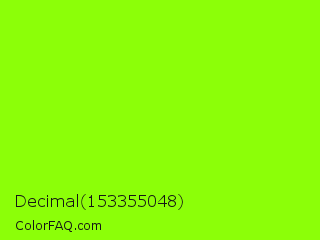 Decimal 153355048 Color is a normal green color and the nearest color is Chartreuse #7fff00. Hex code #8cff08 and RGB value is rgb(140,255,8). In RGB color space, this color is composed of 55% red, 100% green, 3% blue, In CMYK color space, this color is composed of 45% cyan, 0% magenta, 97% yellow , 0% black , In HSL color space, this color has a hue angle of 88° , 100% saturation and 52% lightness.