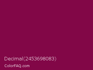 Decimal 2453698083 Color is a dark rose color and the nearest color is Rose Bud Cherry #800b47. Hex code #820747 and RGB value is rgb(130,7,71). In RGB color space, this color is composed of 51% red, 3% green, 28% blue, In CMYK color space, this color is composed of 0% cyan, 95% magenta, 45% yellow , 49% black , In HSL color space, this color has a hue angle of 329° , 90% saturation and 27% lightness.
