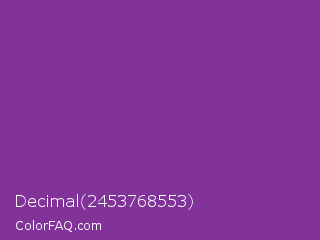 Decimal 2453768553 Color is a normal purple color and the nearest color is Vivid Violet #803790. Hex code #823399 and RGB value is rgb(130,51,153). In RGB color space, this color is composed of 51% red, 20% green, 60% blue, In CMYK color space, this color is composed of 15% cyan, 67% magenta, 0% yellow , 40% black , In HSL color space, this color has a hue angle of 286° , 50% saturation and 40% lightness.