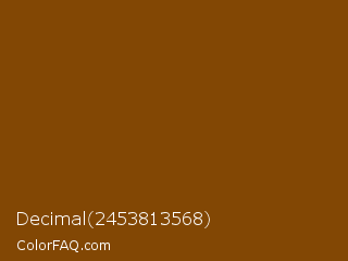 Decimal 2453813568 Color is a dark orange color and the nearest color is Cinnamon #7b3f00. Hex code #824704 and RGB value is rgb(130,71,4). In RGB color space, this color is composed of 51% red, 28% green, 2% blue, In CMYK color space, this color is composed of 0% cyan, 45% magenta, 97% yellow , 49% black , In HSL color space, this color has a hue angle of 32° , 94% saturation and 26% lightness.