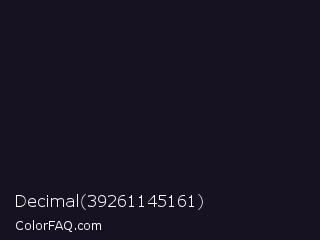 Decimal 39261145161 Color is a very dark indigo color and the nearest color is Vulcan #10121d. Hex code #171221 and RGB value is rgb(23,18,33). In RGB color space, this color is composed of 9% red, 7% green, 13% blue, In CMYK color space, this color is composed of 30% cyan, 45% magenta, 0% yellow , 87% black , In HSL color space, this color has a hue angle of 260° , 29% saturation and 10% lightness.