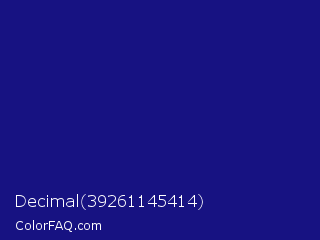 Decimal 39261145414 Color is a dark indigo color and the nearest color is Deep Koamaru #1b127b. Hex code #171282 and RGB value is rgb(23,18,130). In RGB color space, this color is composed of 9% red, 7% green, 51% blue, In CMYK color space, this color is composed of 82% cyan, 86% magenta, 0% yellow , 49% black , In HSL color space, this color has a hue angle of 243° , 76% saturation and 29% lightness.