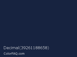 Decimal 39261188658 Color is a very dark blue color and the nearest color is Big Stone #162a40. Hex code #172340 and RGB value is rgb(23,35,64). In RGB color space, this color is composed of 9% red, 14% green, 25% blue, In CMYK color space, this color is composed of 64% cyan, 45% magenta, 0% yellow , 75% black , In HSL color space, this color has a hue angle of 222° , 47% saturation and 17% lightness.