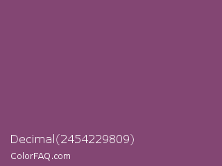 Decimal 2454229809 Color is a normal magenta color and the nearest color is Twilight Lavender #8a496b. Hex code #834673 and RGB value is rgb(131,70,115). In RGB color space, this color is composed of 51% red, 27% green, 45% blue, In CMYK color space, this color is composed of 0% cyan, 47% magenta, 12% yellow , 49% black , In HSL color space, this color has a hue angle of 316° , 30% saturation and 39% lightness.