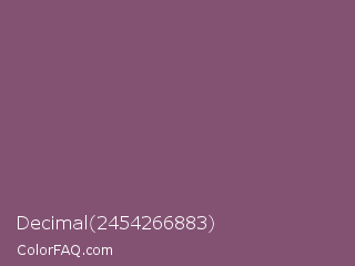 Decimal 2454266883 Color is a normal magenta color and the nearest color is Twilight Lavender #8a496b. Hex code #835273 and RGB value is rgb(131,82,115). In RGB color space, this color is composed of 51% red, 32% green, 45% blue, In CMYK color space, this color is composed of 0% cyan, 37% magenta, 12% yellow , 49% black , In HSL color space, this color has a hue angle of 320° , 23% saturation and 42% lightness.