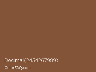 Decimal 2454267989 Color is a normal orange color and the nearest color is Potters Clay #8c5738. Hex code #835437 and RGB value is rgb(131,84,55). In RGB color space, this color is composed of 51% red, 33% green, 22% blue, In CMYK color space, this color is composed of 0% cyan, 36% magenta, 58% yellow , 49% black , In HSL color space, this color has a hue angle of 23° , 41% saturation and 36% lightness.