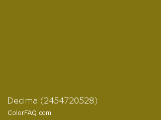 Decimal 2454720528 Color is a dark yellow color and the nearest color is Corn Harvest #8b6b0b. Hex code #837412 and RGB value is rgb(131,116,18). In RGB color space, this color is composed of 51% red, 45% green, 7% blue, In CMYK color space, this color is composed of 0% cyan, 11% magenta, 86% yellow , 49% black , In HSL color space, this color has a hue angle of 52° , 76% saturation and 29% lightness.