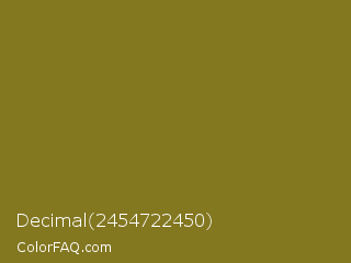 Decimal 2454722450 Color is a normal yellow color and the nearest color is Pacifika #778120. Hex code #837720 and RGB value is rgb(131,119,32). In RGB color space, this color is composed of 51% red, 47% green, 13% blue, In CMYK color space, this color is composed of 0% cyan, 9% magenta, 76% yellow , 49% black , In HSL color space, this color has a hue angle of 53° , 61% saturation and 32% lightness.