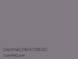 Decimal 2454725632 Color is a normal magenta color and the nearest color is Hurricane #877c7b. Hex code #837980 and RGB value is rgb(131,121,128). In RGB color space, this color is composed of 51% red, 47% green, 50% blue, In CMYK color space, this color is composed of 0% cyan, 8% magenta, 2% yellow , 49% black , In HSL color space, this color has a hue angle of 318° , 4% saturation and 49% lightness.