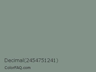 Decimal 2454751241 Color is a normal green color and the nearest color is Dolphin Gray #828e84. Hex code #839289 and RGB value is rgb(131,146,137). In RGB color space, this color is composed of 51% red, 57% green, 54% blue, In CMYK color space, this color is composed of 10% cyan, 0% magenta, 6% yellow , 43% black , In HSL color space, this color has a hue angle of 144° , 6% saturation and 54% lightness.