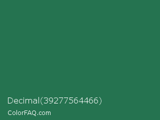 Decimal 39277564466 Color is a dark green color and the nearest color is Dark Spring Green #177245. Hex code #257350 and RGB value is rgb(37,115,80). In RGB color space, this color is composed of 15% red, 45% green, 31% blue, In CMYK color space, this color is composed of 68% cyan, 0% magenta, 30% yellow , 55% black , In HSL color space, this color has a hue angle of 153° , 51% saturation and 30% lightness.