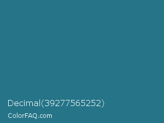 Decimal 39277565252 Color is a normal cyan color and the nearest color is Calypso #31728d. Hex code #257488 and RGB value is rgb(37,116,136). In RGB color space, this color is composed of 15% red, 45% green, 53% blue, In CMYK color space, this color is composed of 73% cyan, 15% magenta, 0% yellow , 47% black , In HSL color space, this color has a hue angle of 192° , 57% saturation and 34% lightness.