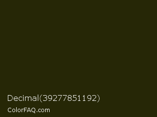 Decimal 39277851192 Color is a almost black yellow color and the nearest color is Onion #2f270e. Hex code #262706 and RGB value is rgb(38,39,6). In RGB color space, this color is composed of 15% red, 15% green, 2% blue, In CMYK color space, this color is composed of 3% cyan, 0% magenta, 85% yellow , 85% black , In HSL color space, this color has a hue angle of 62° , 73% saturation and 9% lightness.